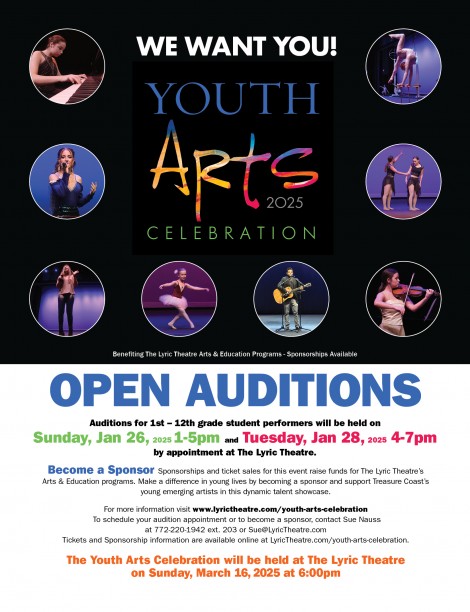 Ticket sales and Sponsorships for The Youth Arts Celebration raise funds to expand The Lyric Theatre Arts & Education Programs affording Treasure Coast youth even more educational opportunities for cultural enrichment. The Lyric’s Arts & Education Programs provide master class and residency opportunities for students in area schools; The Discovery Series for Young Audiences, a series of school-time shows exposing students to live theatre and correlating theatrical content to standards-based curriculum; Family Fun Series provides the magic of live entertainment, reinforcing the fundamental values of time spent as a family; and building character on and off the stage at The Lyric’s AWESOME! Summer Camp.