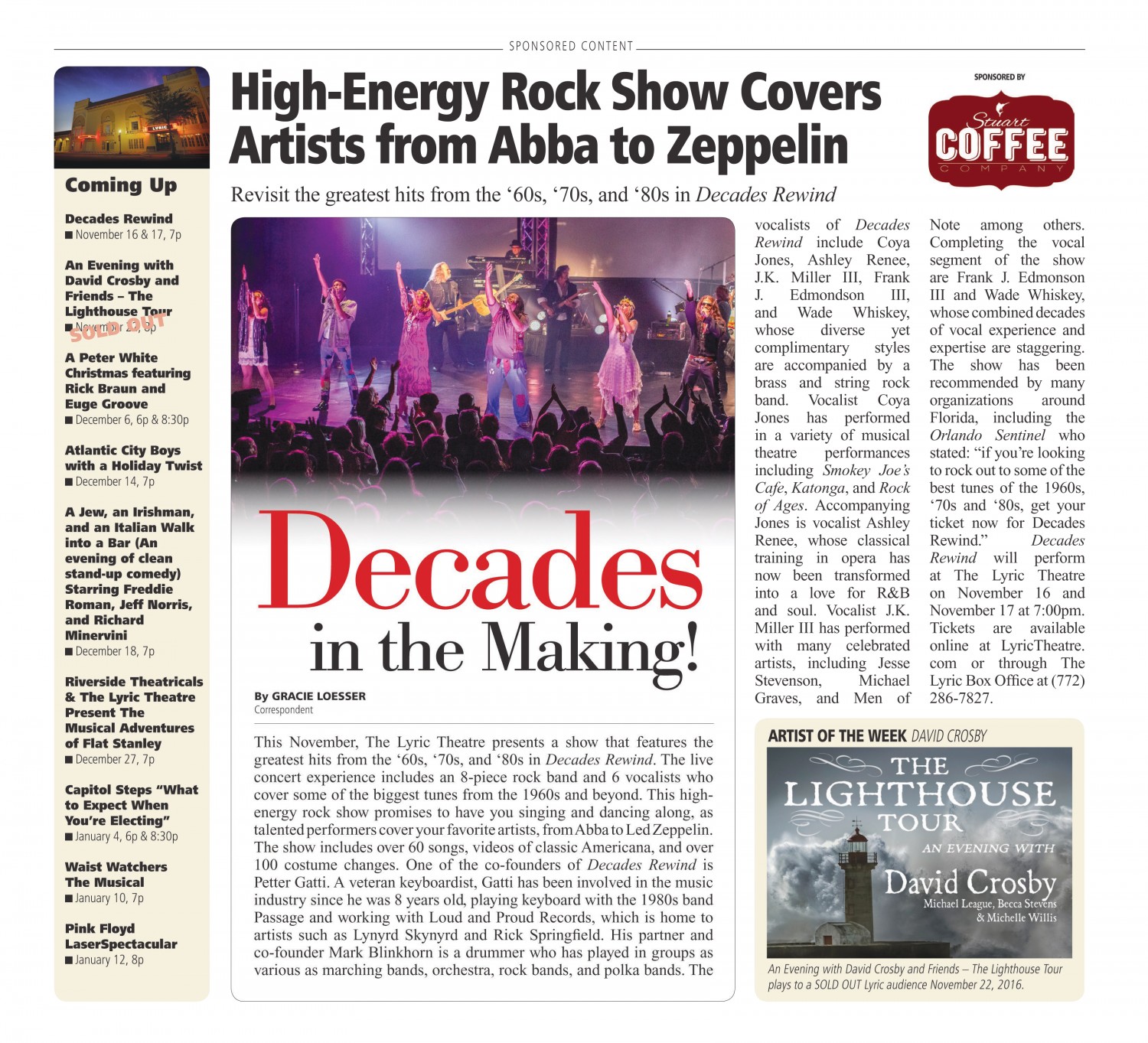 Friday, November 4, 2016This November, The Lyric Theatre presents a show that features the greatest hits from the ‘60s, ‘70s, and ‘80s in Decades Rewind. The live concert experience includes an 8-piece rock band and 6 vocalists who cover some of the biggest tunes from the 1960s and beyond. This high-energy rock show promises to have you singing and dancing along, as talented performers cover your favorite artists, from Abba to Led Zeppelin. The show includes over 60 songs, videos of classic Americana, and over 100 costume changes. One of the co-founders of Decades Rewind is Petter Gatti. A veteran keyboardist, Gatti has been involved in the music industry since he was 8 years old, playing keyboard with the 1980s band Passage and working with Loud and Proud Records, which is home to artists such as Lynyrd Skynyrd and Rick Springfield. His partner and co-founder Mark Blinkhorn is a drummer who has played in groups as various as marching bands, orchestra, rock bands, and polka bands. The vocalists of Decades Rewind include Coya Jones, Ashley Renee, J.K. Miller III, Frank J. Edmondson III, and Wade Whiskey, whose diverse yet complimentary styles are accompanied by a brass and string rock band. Vocalist Coya Jones has performed in a variety of musical theatre performances including Smokey Joe’s Cafe, Katonga, and Rock of Ages. Accompanying Jones is vocalist Ashley Renee, whose classical training in opera has now been transformed into a love for R&B and soul. Vocalist J.K. Miller III has performed with many celebrated artists, including Jesse Stevenson, Michael Graves, and Men of Note among others. Completing the vocal segment of the show are Frank J. Edmonson III and Wade Whiskey, whose combined decades of vocal experience and expertise are staggering. The show has been recommended by many organizations around Florida, including the Orlando Sentinel who stated: “if you’re looking to rock out to some of the best tunes of the 1960s, ‘70s and ‘80s, get your ticket now for Decades Rewind.” Decades Rewind will perform at The Lyric Theatre on November 16 and November 17 at 7:00pm. Tickets are available online at LyricTheatre.com or through The Lyric Box Office at (772) 286-7827.