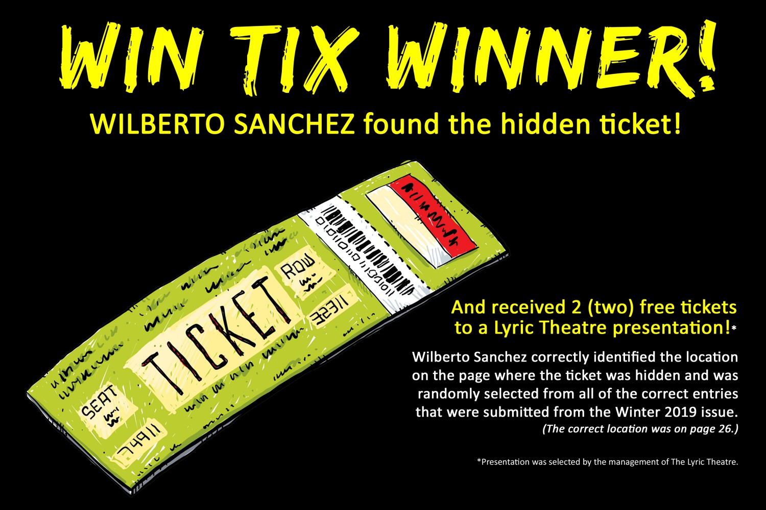 Wilberto Sanchez correctly identified the location on the page where the ticket was hidden and was randomly selected from all of the correct entries that were submitted from the Lyric Magazine, Winter 2019 Issue.